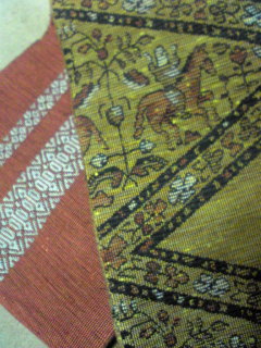 ↓最近買った半幅帯、リバーシブルで、騎馬武者?の柄なんですよ~!動物とか、鳥さんの柄に弱いんです。