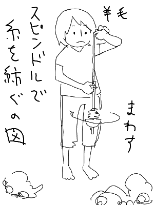 羊毛をスピンドルで糸にするところ。あいかわらず躍動感に欠けるな。糸がモコモコしてきて上手く回せなくなってきちゃった。明日は羊毛を染めるらしい。楽しみー。