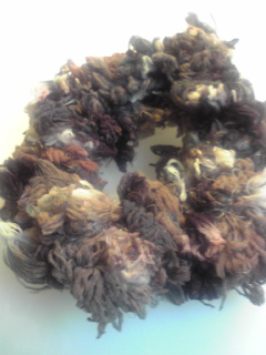 ↓もけもけの毛糸を買ってきたのでシュシュ作ってみました。タヌキなカラーリングが良い・・・