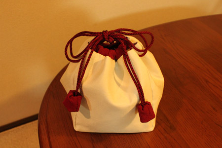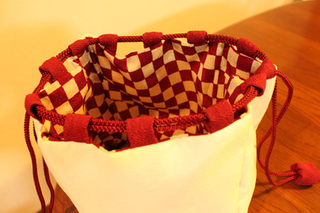 内袋の市松模様と、赤い紐通しは、縮緬です。しうかつの合間に探し求めました。