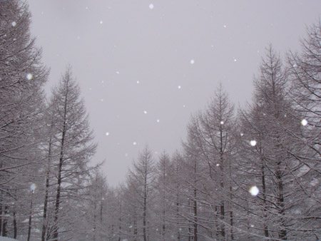 ↓初日のゲレンデ。私のお気に入り林間コースです。偶然ですが、降ってくる雪がきれいに撮れていました。