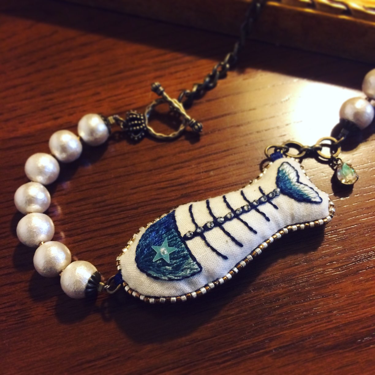 カジキの刺繍ネックレスやたぬきブローチに加えて、いくつか新作もできました。